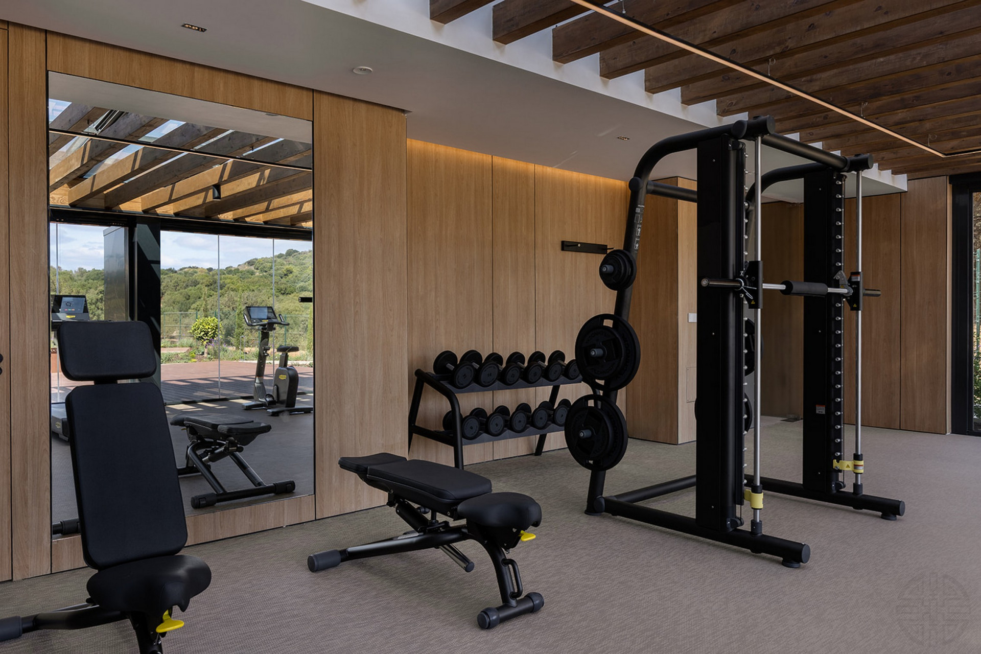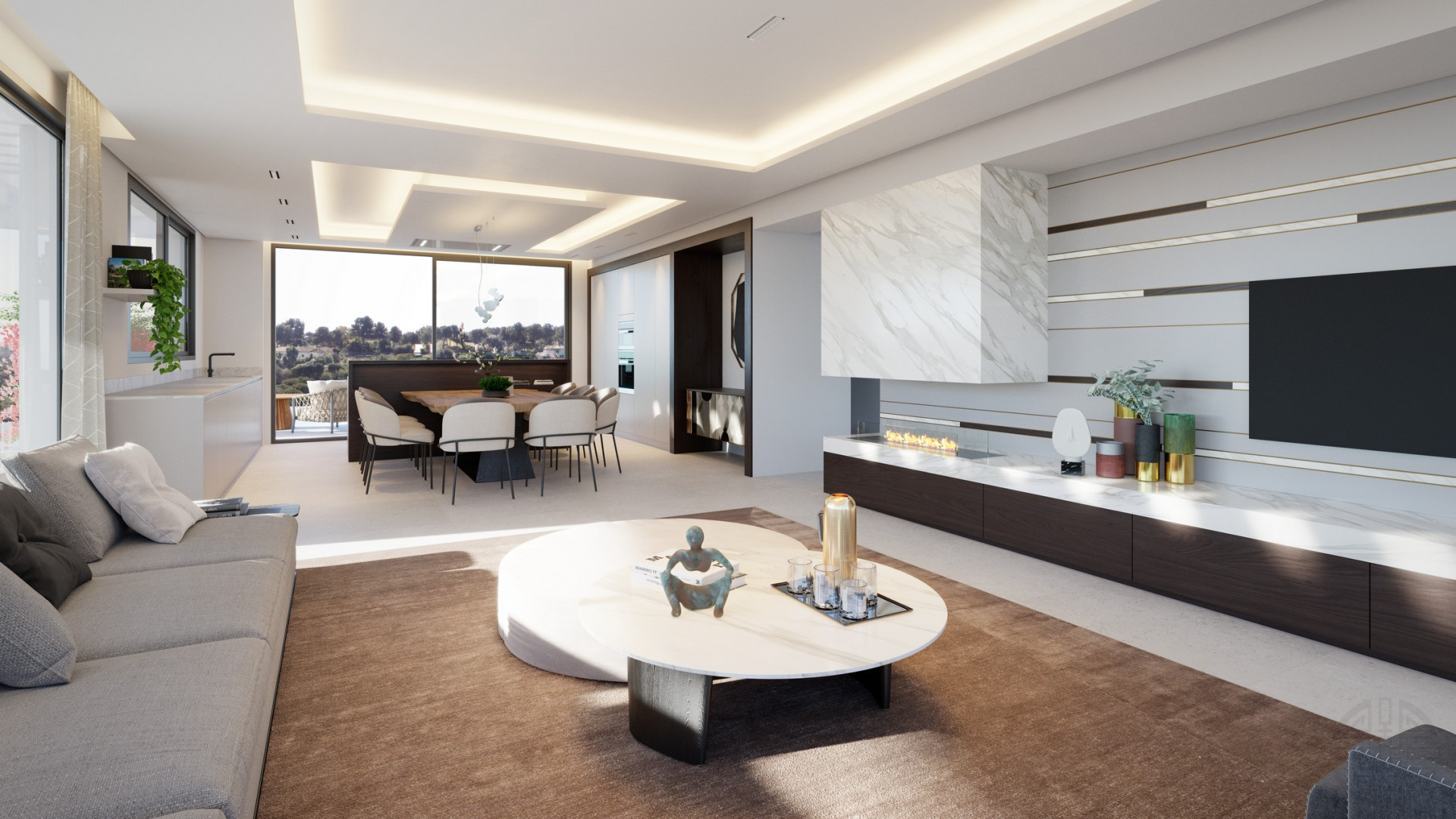 El diseño de planta abierta está bañado en luz natural gracias a las amplias ventanas de piso a techo, conectando sin esfuerzo los espacios interiores y exteriores.